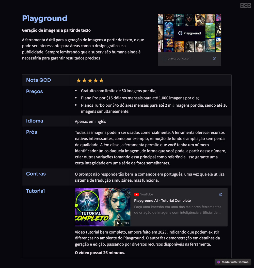 Este Guia é uma ferramenta essencial para todo profissional, principalmente aqueles que estão perdidos e nem sabem por onde começar os estudos em IA. Ele traz casos para utilização e principalmente a indicação de ferramentas úteis que foram testadas e aplicadas em diversas situações. Você entende bem como pode usar cada uma e não perde tempo testando coisas que não forem úteis, ou seja agiliza o processo daquilo que você precisa para a sua prática em seus projetos. Além disso, o Guia faz a curadoria de tutoriais que são úteis para que você aprenda a usar cada uma. Para quem trabalha com conteúdo e Marketing, o guia traz inclusive sugestão de prompt muito útil que acelera a criação de planejamento de Marketing Digital.