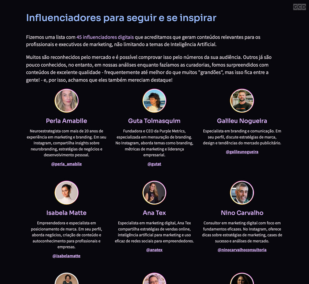 Fizemos uma lista com 48 influenciadores digitais que acreditamos que geram conteúdos relevantes para os profissionais e executivos de marketing, não limitando a temas de Inteligência Artificial.